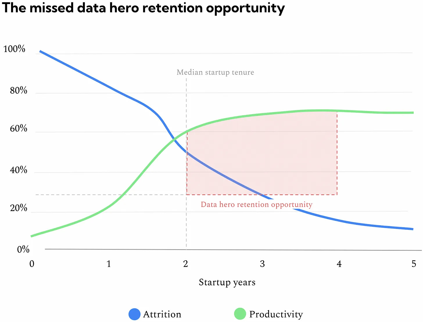 結果として、データを使える人材は2年ほど経ったあたりで他の会社に移っていきがちです。(これは労働市場が緩やかで動きやすいアメリカで特に顕著です。)しかし、これはなんとももったいないことです。というのも、どんな仕事でも生産性が高まっていくのは仕事についてから1、2年ほど経ってからだからです。