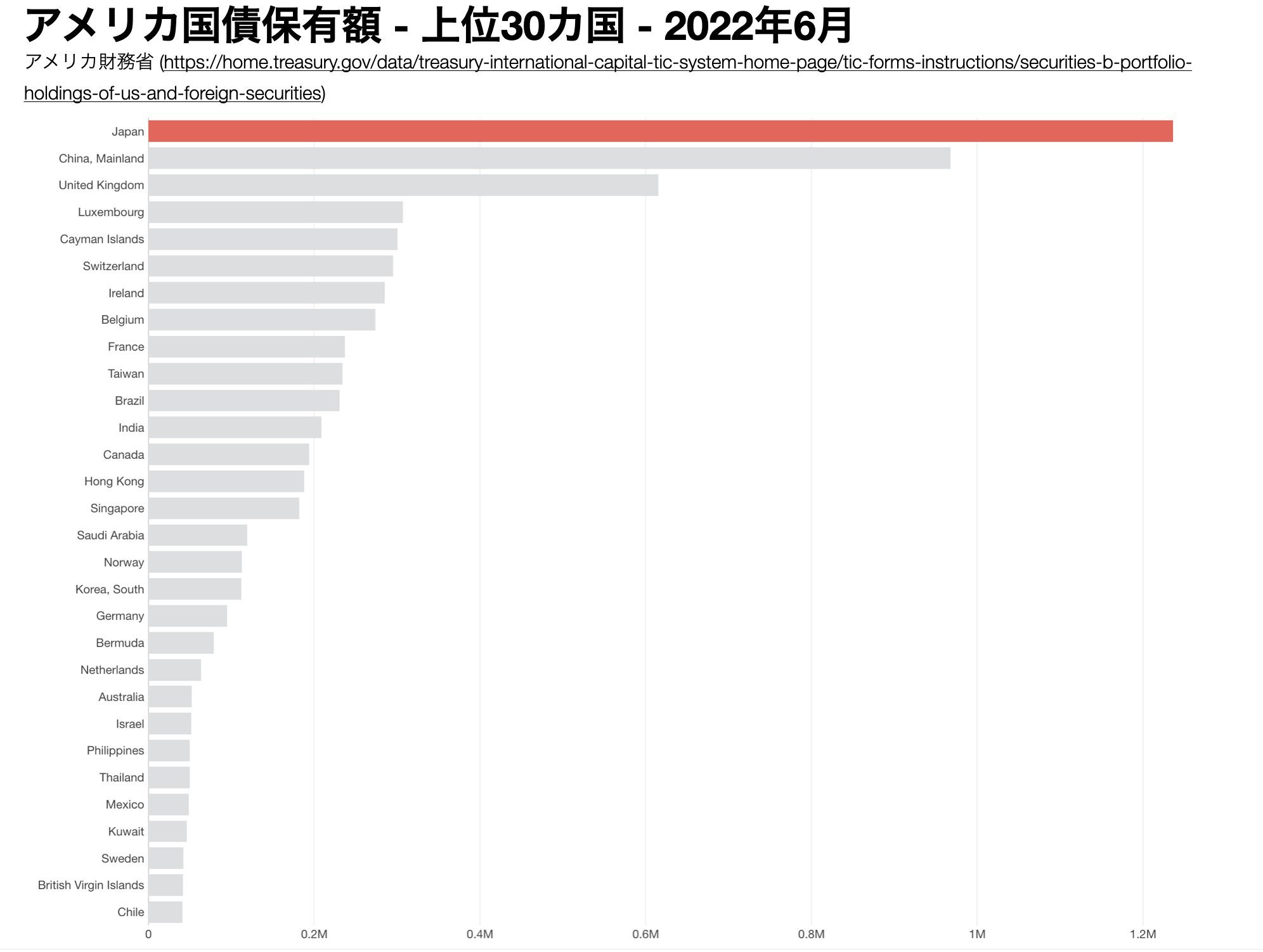 アメリカ国債の国別保有高(上位30カ国)を可視化したのが以下のチャートです。